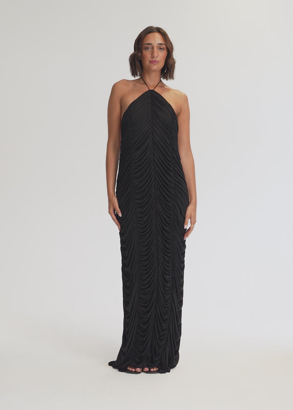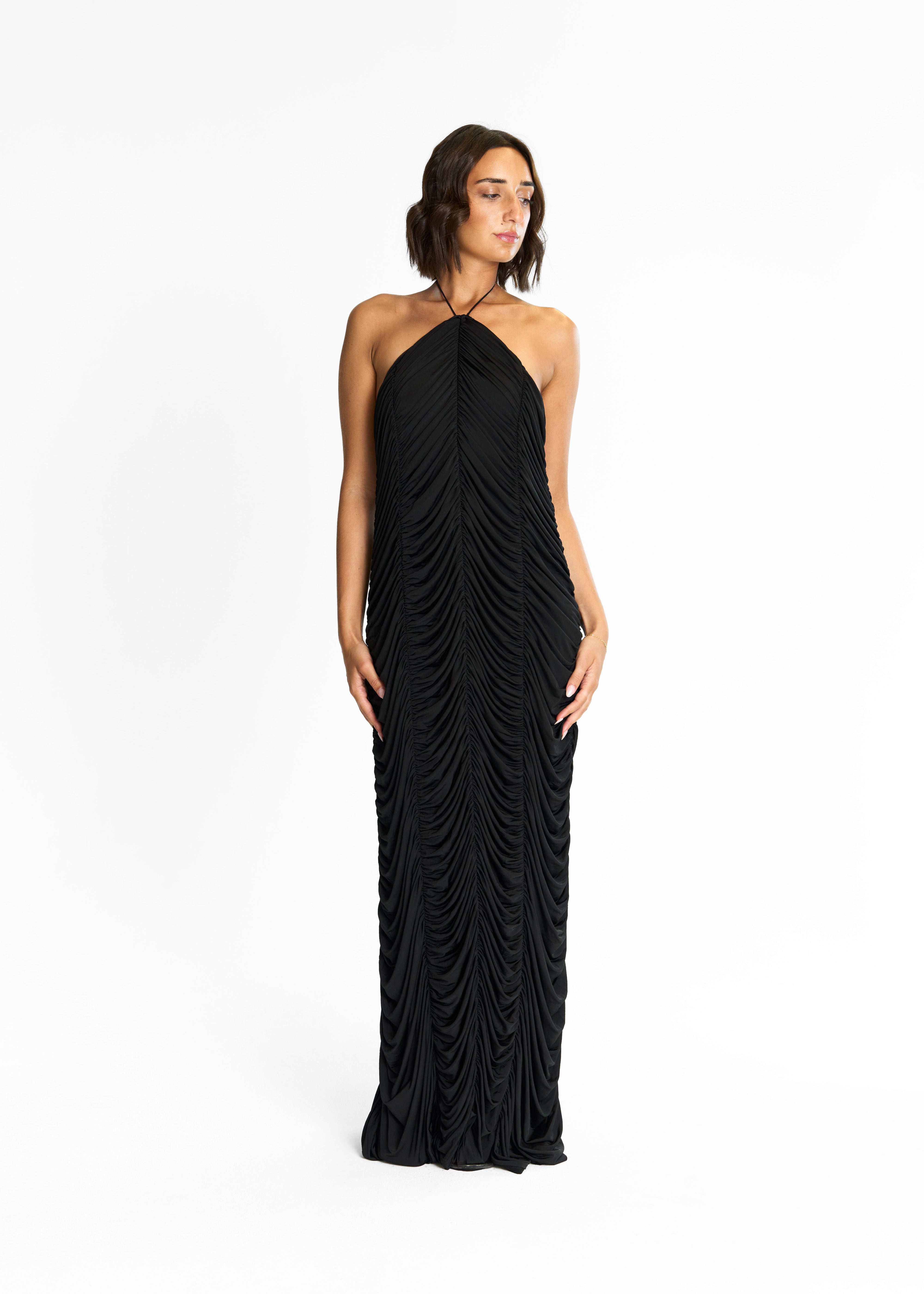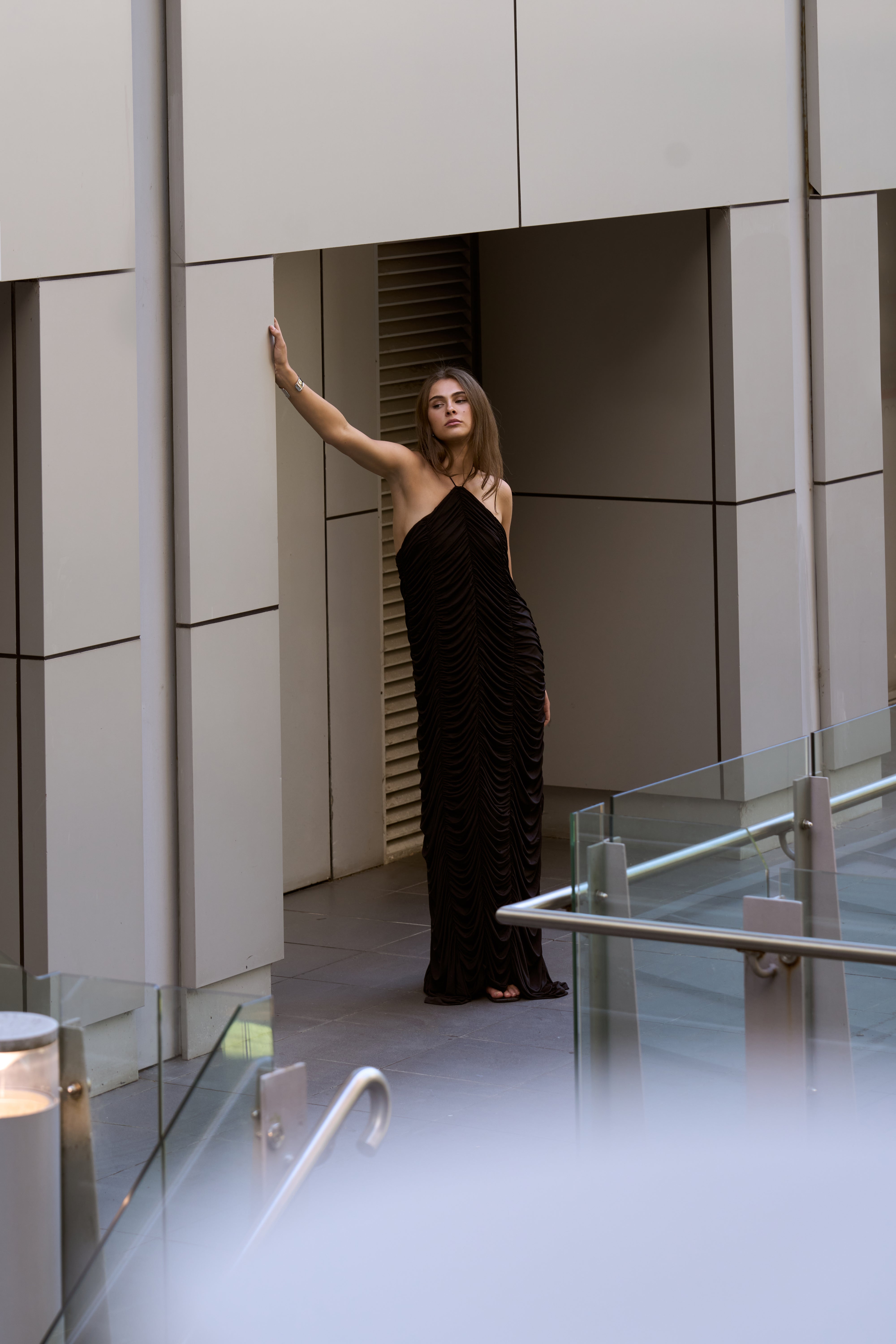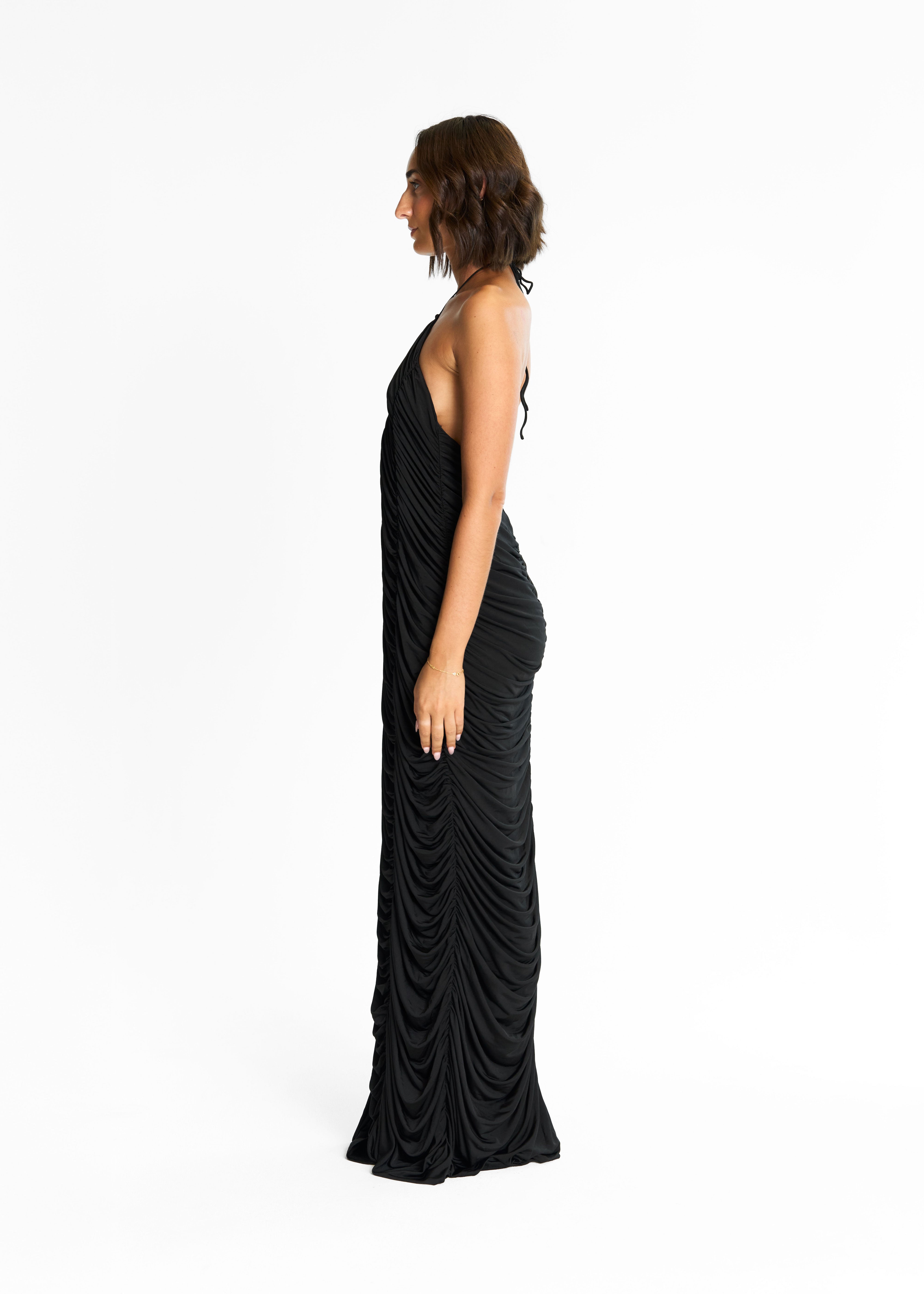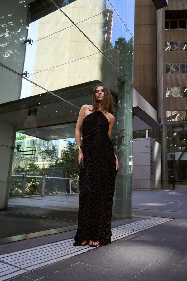 The Adaline Maxi Dress in Onyx draws inspiration from 18th-century European interiors, where weightless drapery and lavish textiles softened grand architectural forms. Interpreted through a contemporary lens, Adaline captures this same sense of fluidity and balance.