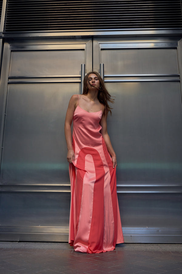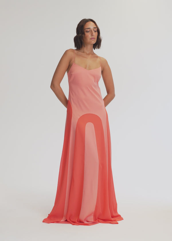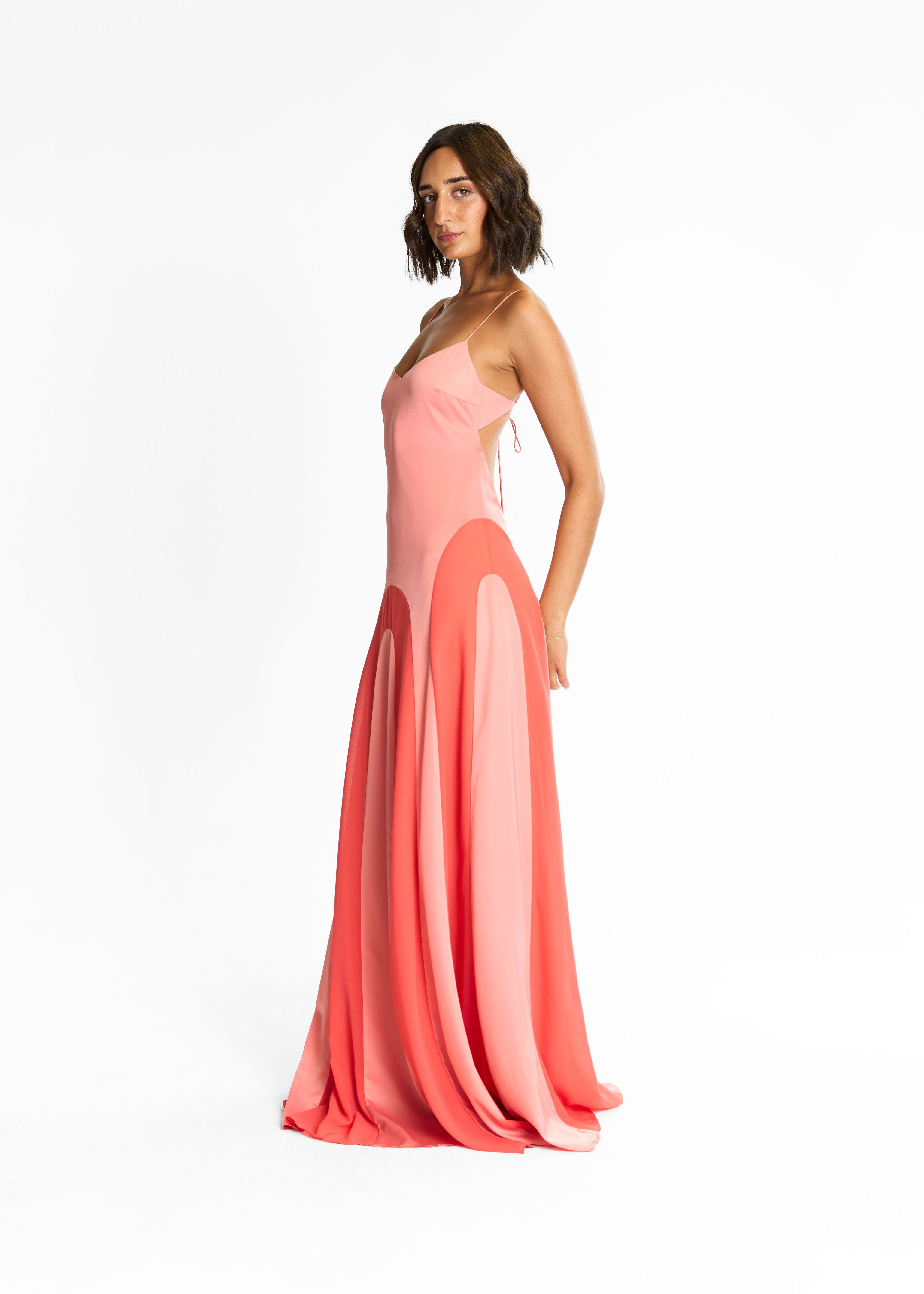 The Arc Panel Maxi Dress in Sorbet draws on architectural lines softened by movement. Designed with curved godets, the skirt opens with soft volume and movement, adding sculptural dimension without weight.