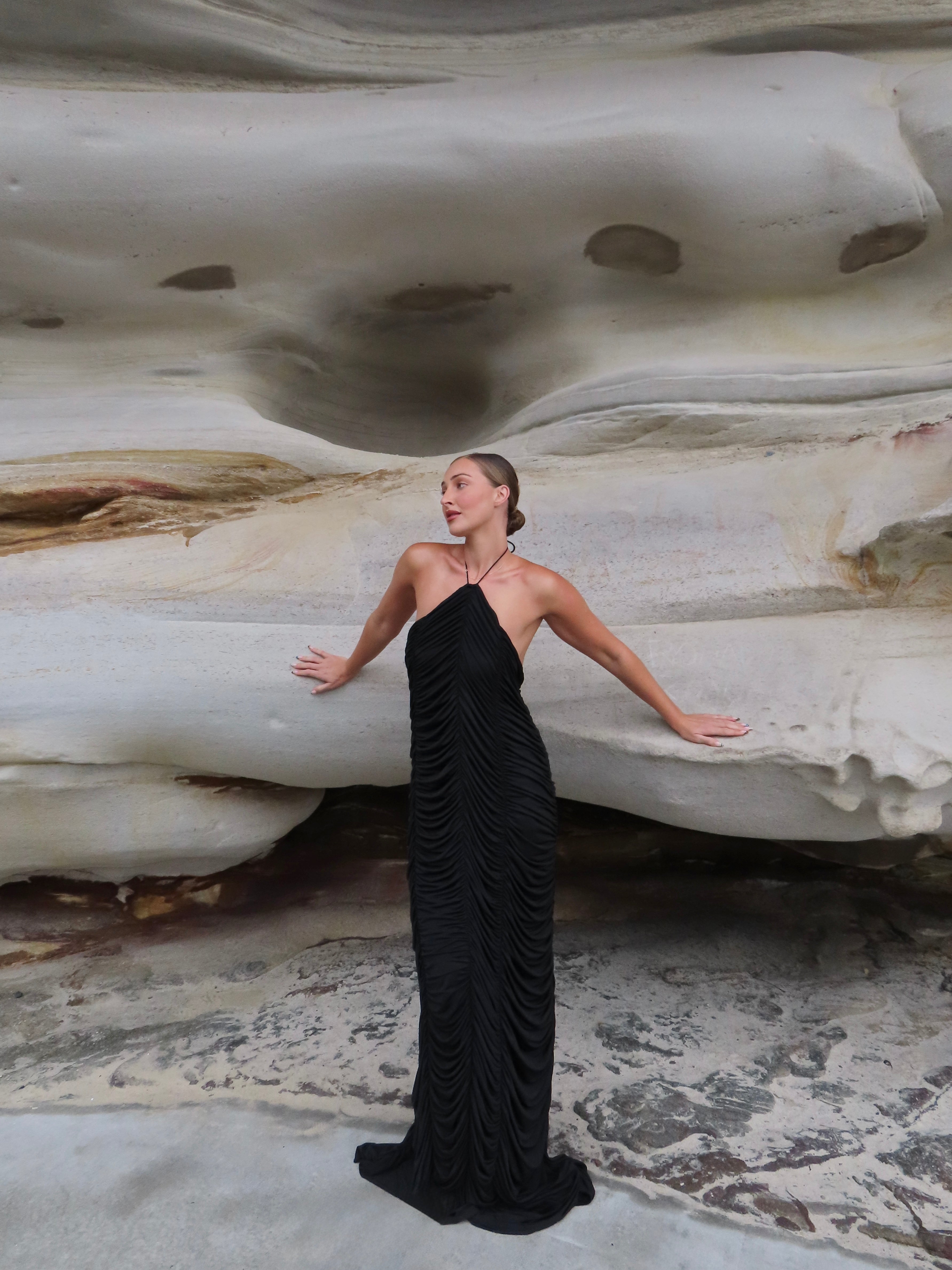 Fit: Designed to drape the body loosely. Floor Length with adjustable halter neck tie.