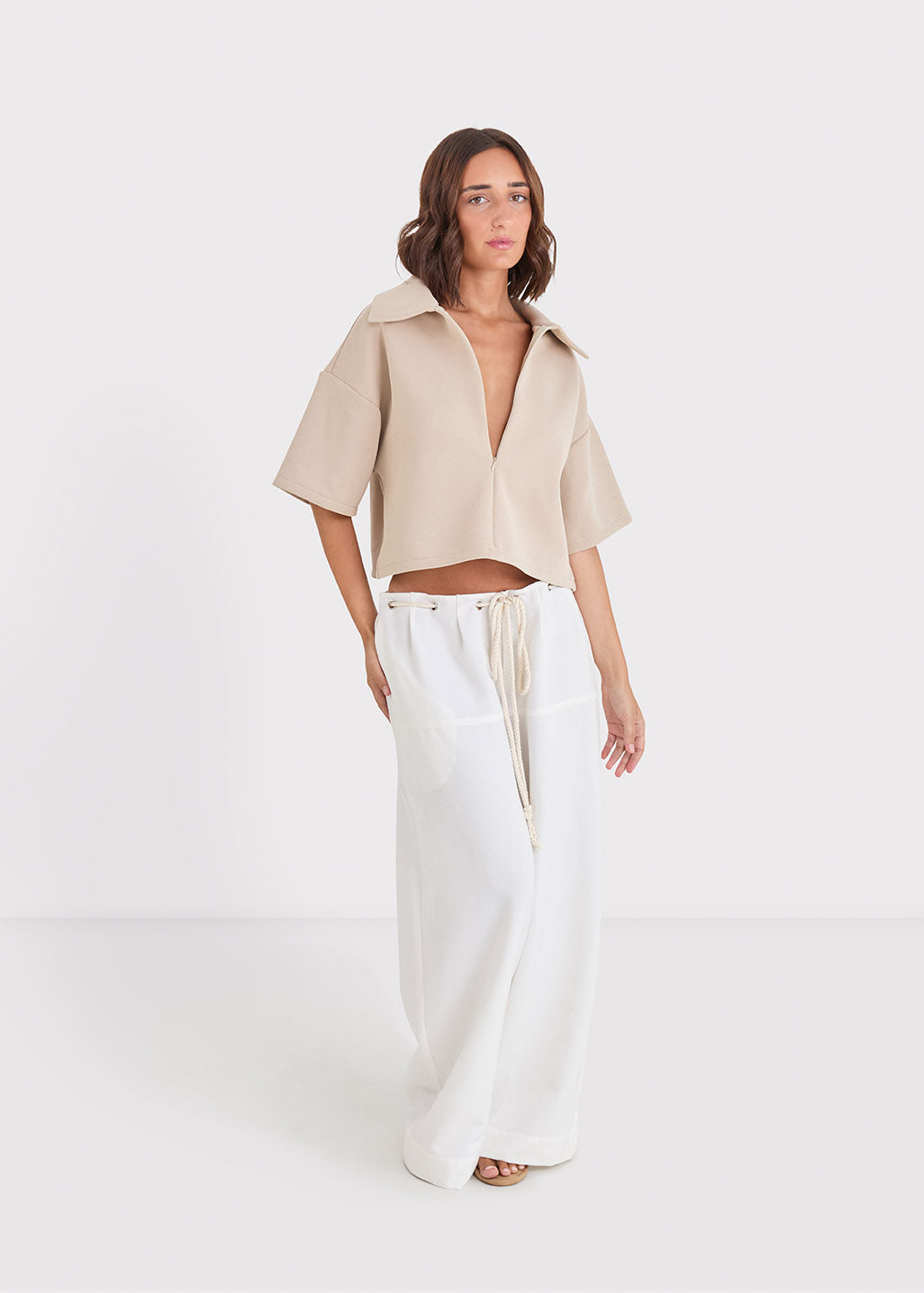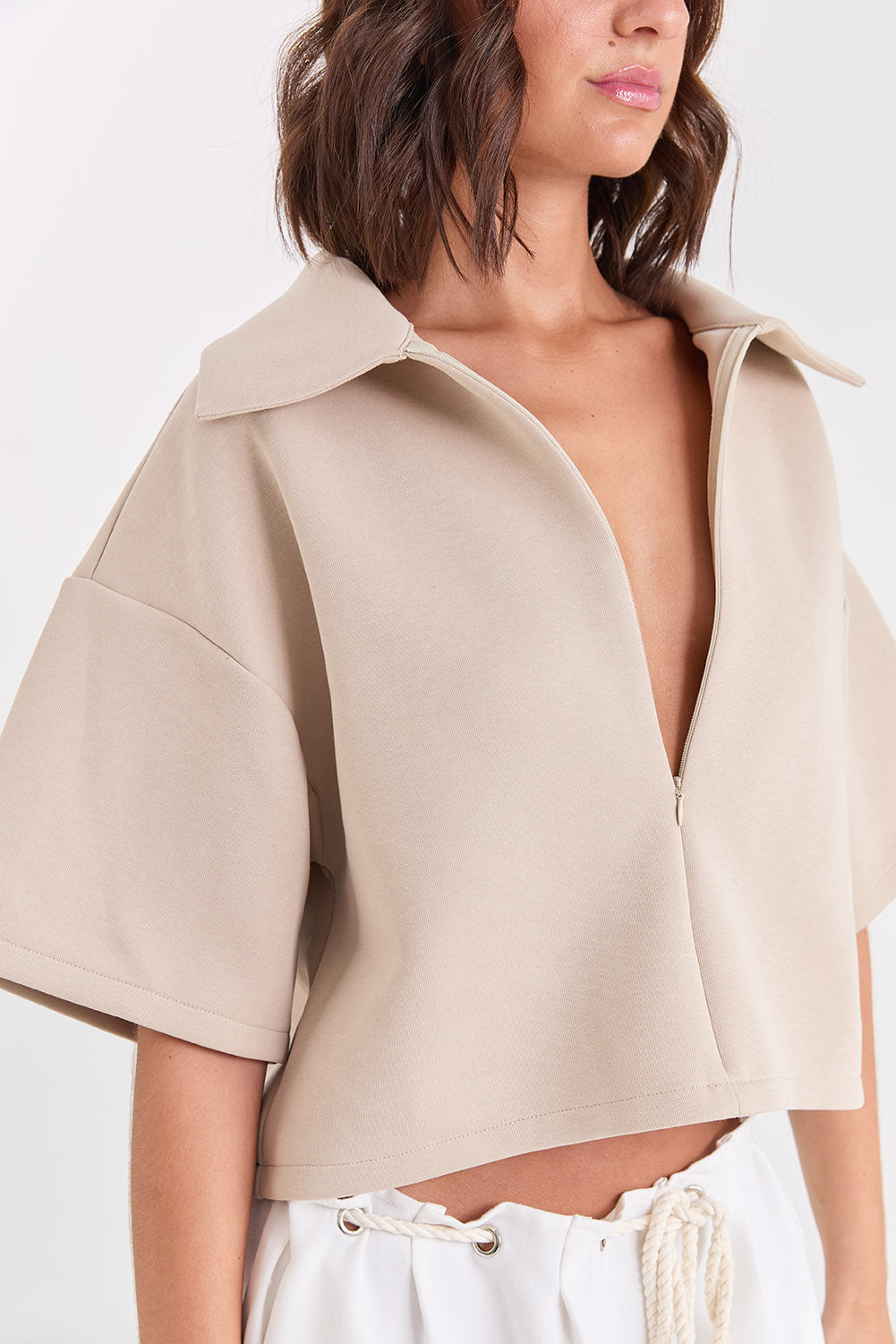 The Koa Quarter Zip Tee is crafted from a thick, bonded scuba fabrication that holds structure while remaining soft on the body. Designed with a relaxed, cropped silhouette, it features a sharp collar and quarter zip neckline that can be worn open or closed depending on styling.